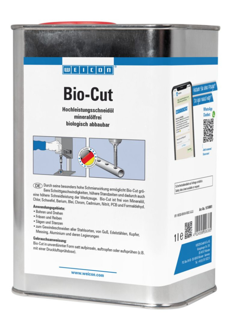 A Bio-Cut olyan hűtőfolyadék, mely vízzel nem keveredik, és elsősorban a fémek vágásához, alacsony és magasan ötvözött acél, rozsdamentes acél, alumínium és vasmentes nehézfémek nemfémes feldolgozásához használatos.Ez a nagyteljesítményű termék nem tartalmaz ásványolajokat, és biológiailag teljesen lebomló. A Bio-Cut hosszú ideig megvédi a berendezéseket és a szerelvényeket a korrózió ellen.Felhasználási területek• fúrás, esztergálás, fényezés• őrlés, üregelés, fűrészelés• lyukasztás, hajlítás, sajtolás• menetvágás bármilyen minőségű acél, öntöttvas, rozsdamentes acél, réz, sárgaréz, alumínium anyagba és ezek ötvözeteibeMivel nem tartalmaz klórt, ként, báriumot, ólomot, kadmiumot, nitritet, PCB-t és formaldehidet, aktívan védi a környezetet.